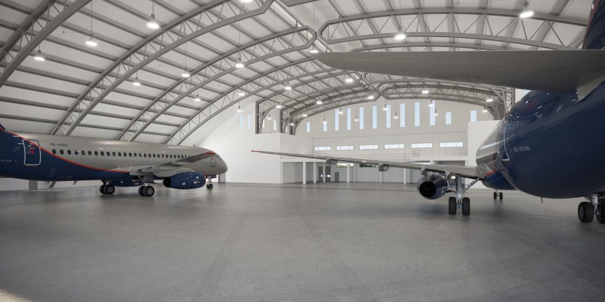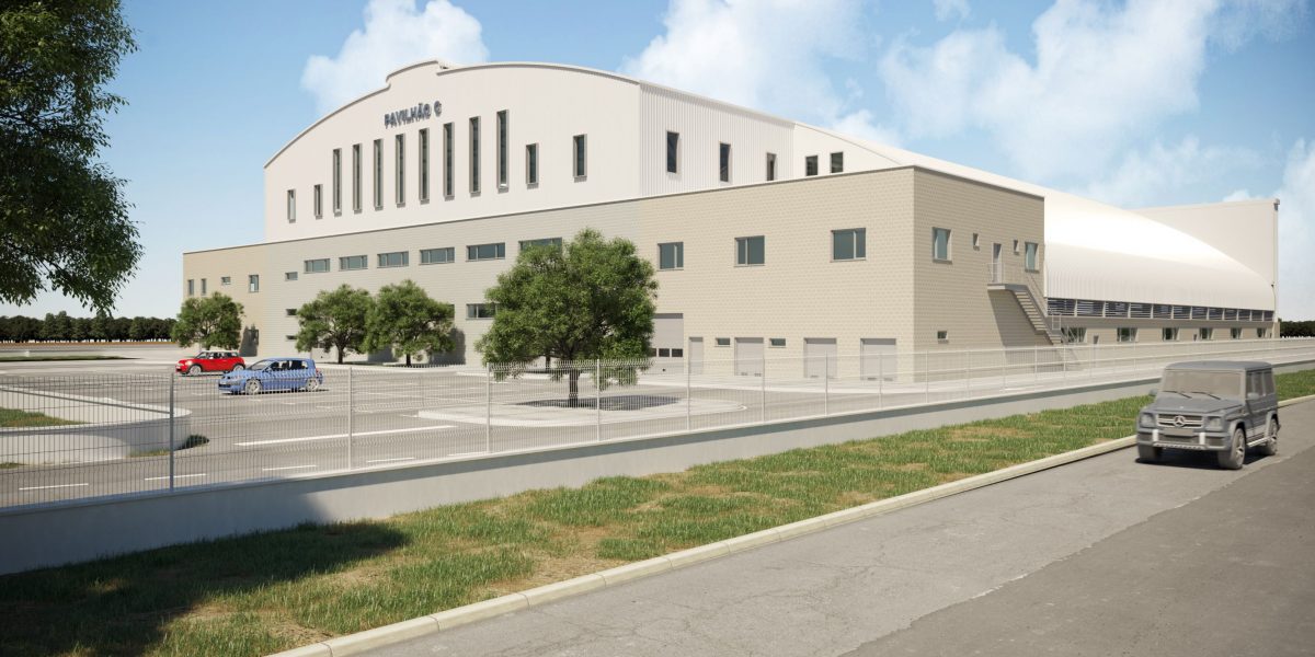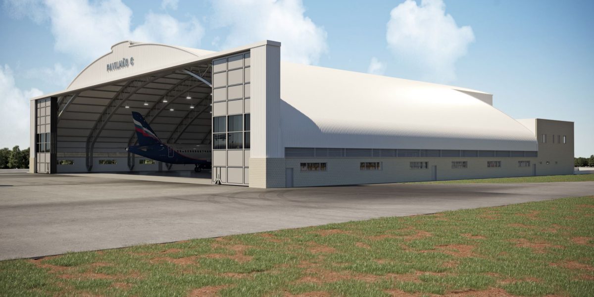 Hangar com 80 metros de vão em estrutura metálica, que inclui parte edificada em betão armado para apoio das oficinas aeronáuticas.