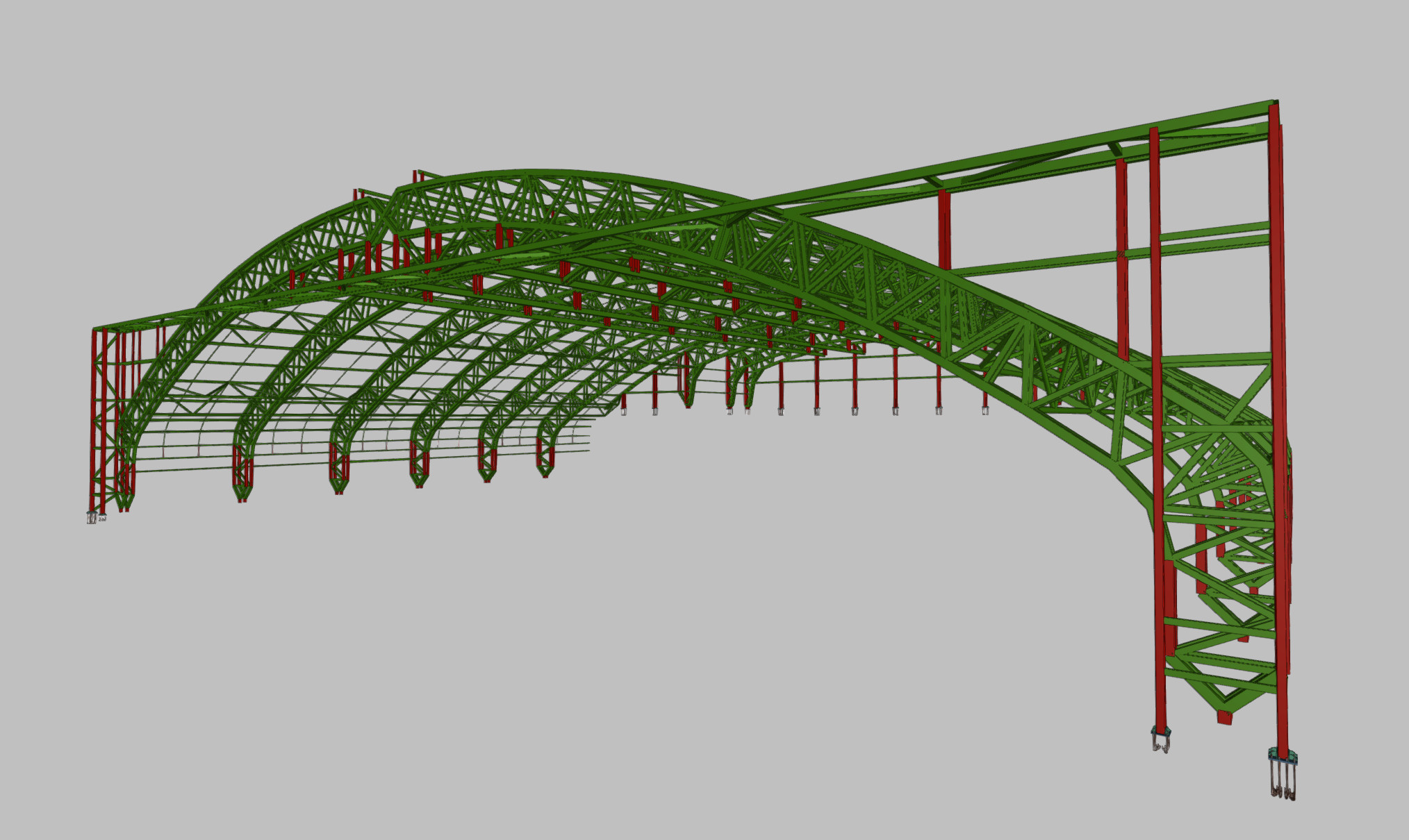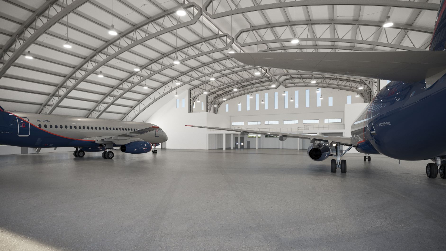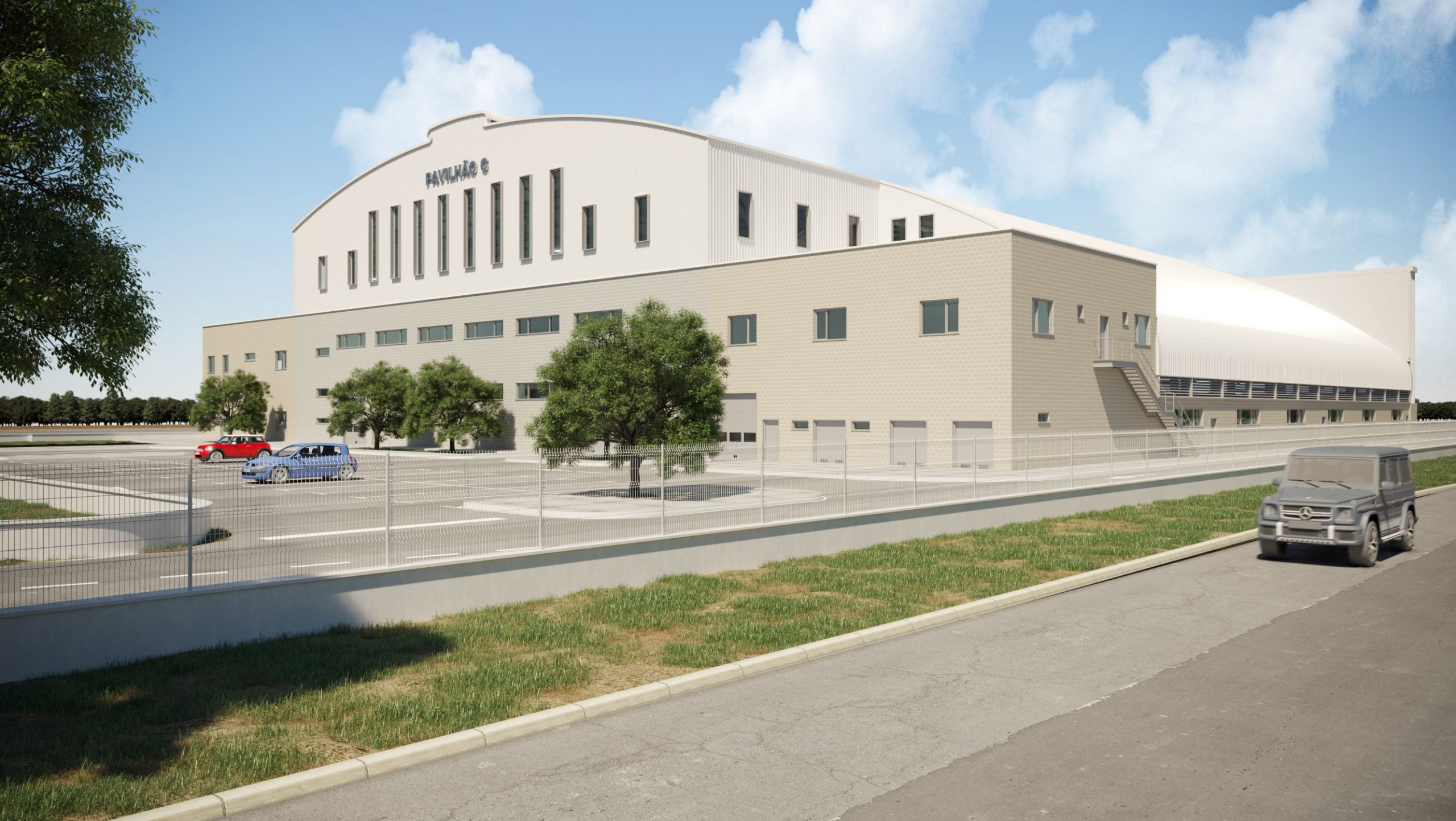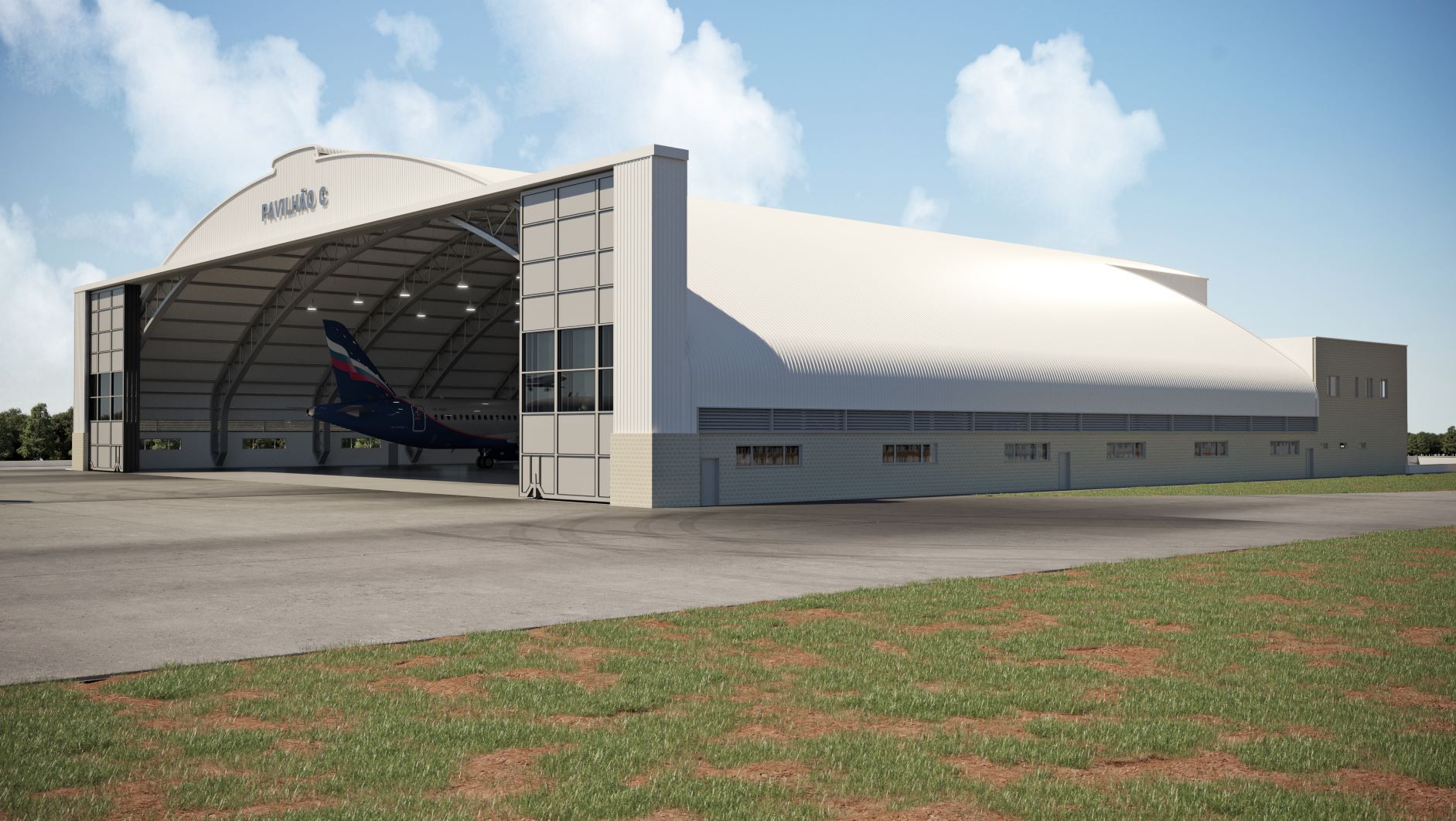 Hangar com 80 metros de vão em estrutura metálica, que inclui parte edificada em betão armado para apoio das oficinas aeronáuticas.